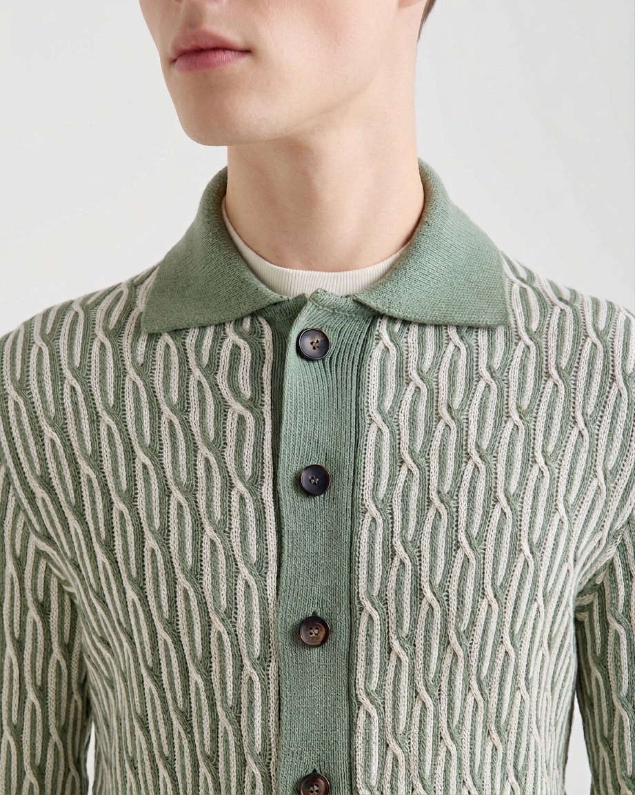 Maglia camicia van Filippo De Laurentiis: een verfijnde gebreide overhemd-cardigan in salvia (saliegroen) met latte (crème) contrast. Een echt Italiaans middengewicht stuk dat het comfort van een trui combineert met de elegantie van een overhemd.