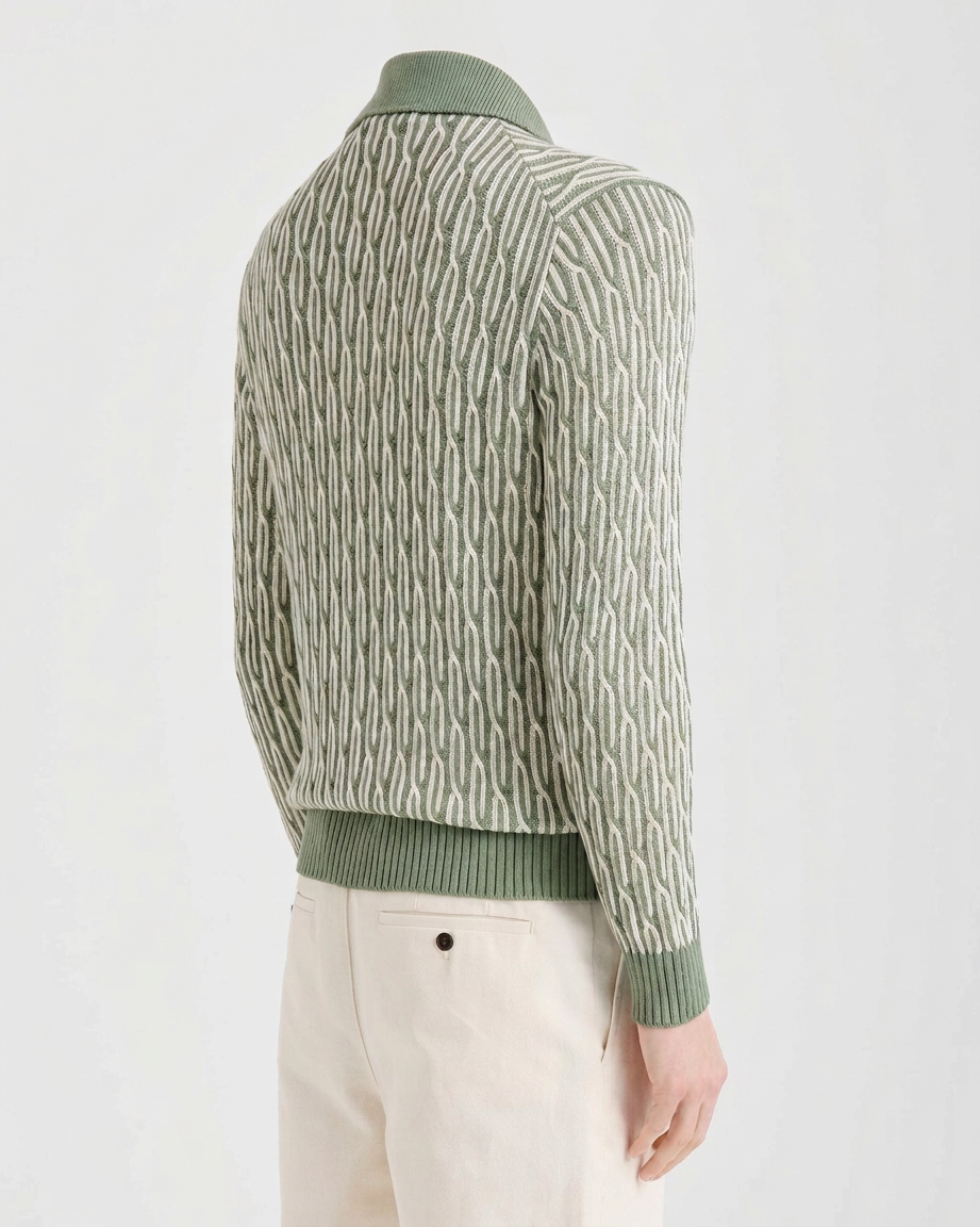 Filippo De Laurentiis staat voor de meest verfijnde Italiaanse maglieria. De maglia camicia is hét emblematische stuk van het huis: een gebreid overhemd dat de soepelheid van tricot verenigt met de structuur van een colbert. De treccia bicolore — de tweekleurige vlecht — is het signatuur-motief, met de hand uitgewerkt in finezza 7 voor een uitgesproken reliëf en chromatische diepte.