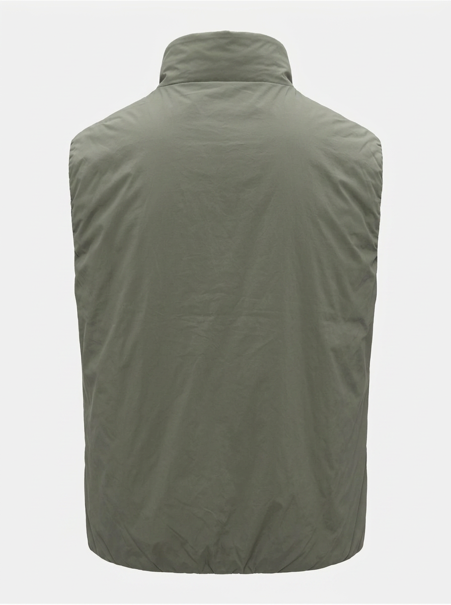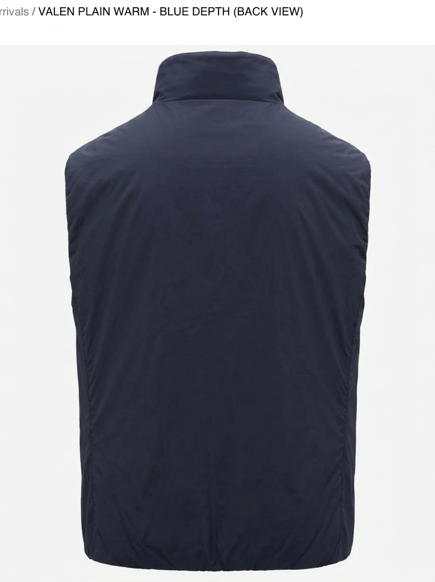 Valen Plain Warm is een lichte gewatteerde bodywarmer voor het tussenseizoen: mouwloos silhouet met technische nylon buitenstof en warme isolatie. Propere snit met opstaande kraag, volledige rits en steekzakken — packable, weerbestendig en perfect over een polo of trui.
